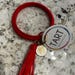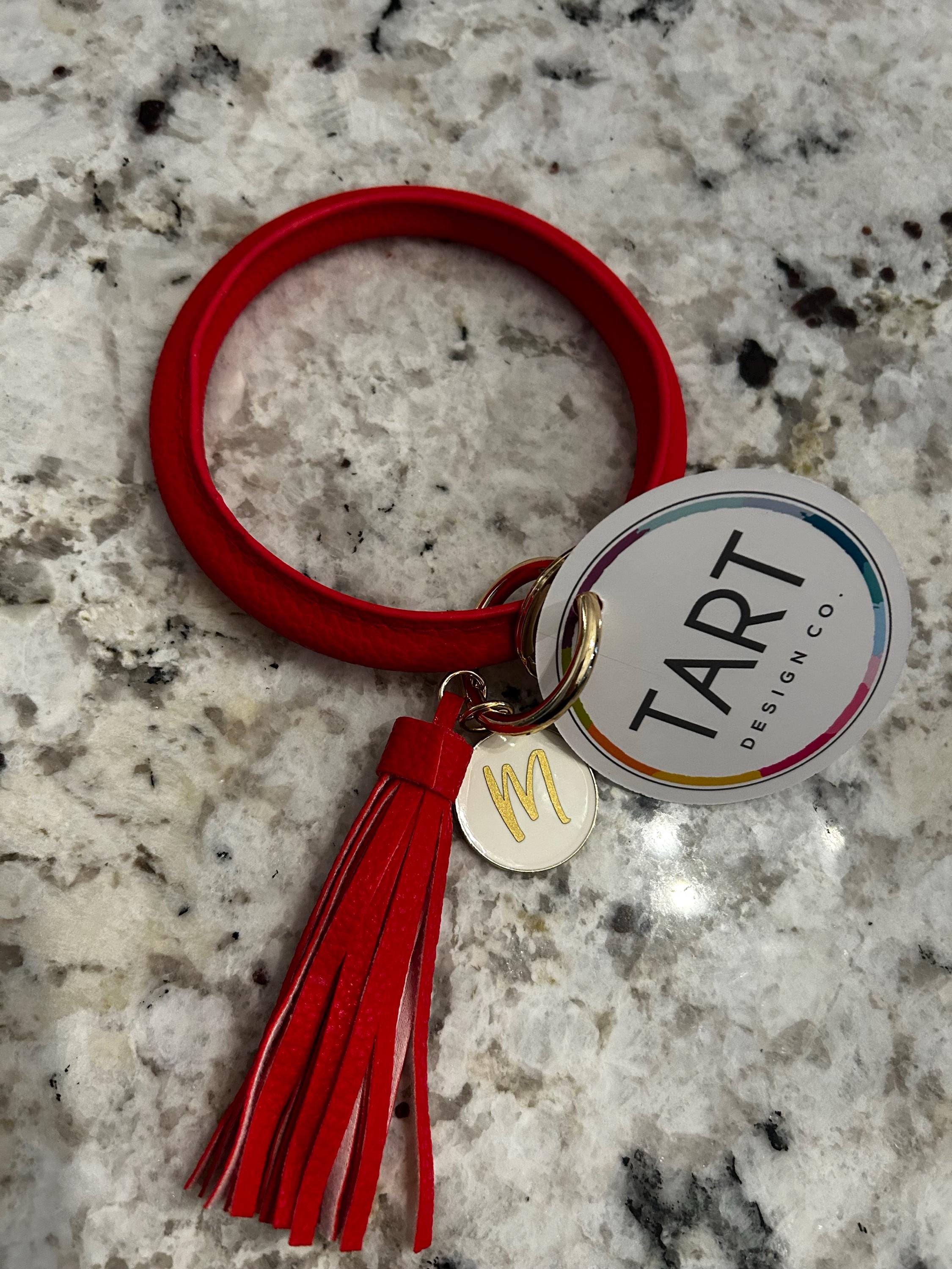 This Wristlet keychain includes a bangle style keyring, a stylish tassel, a brass gold hardware, white round golden ornament that can be personalized with a vinyl letter if gold or rose gold or the bangle can be worn plain. This bangle design is oversized at 4.25 inches in order to easily slip on and off your wrist.