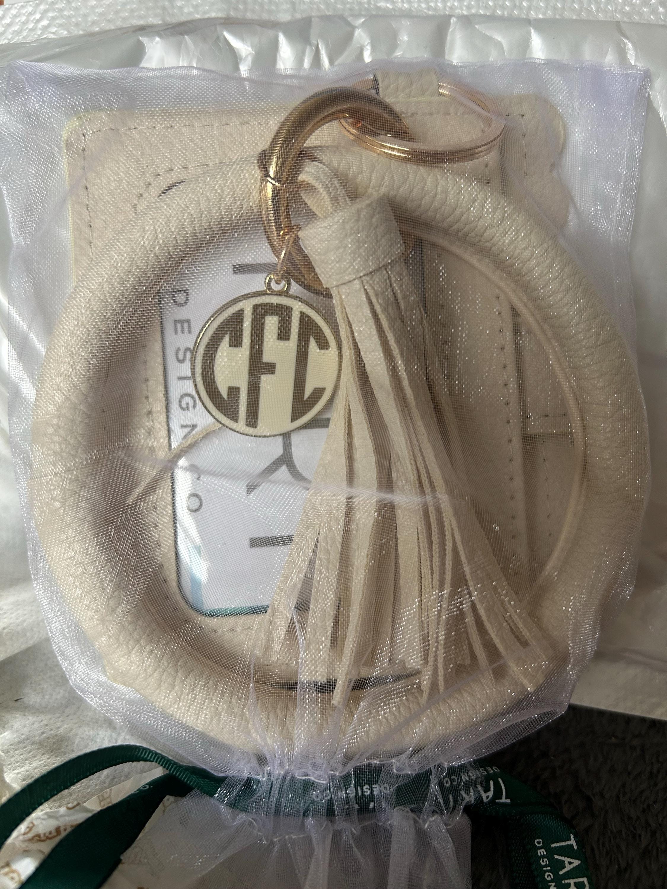 This Wallet Bangle keychain includes a bracelet style keyring, a stylish tassel, a gold ring, white round golden ornament that can be personalized with a vinyl letter if gold or rose gold or the bangle can be worn plain. This bangle design is oversized at 4.24 inches to easily slip on and off your wrist.